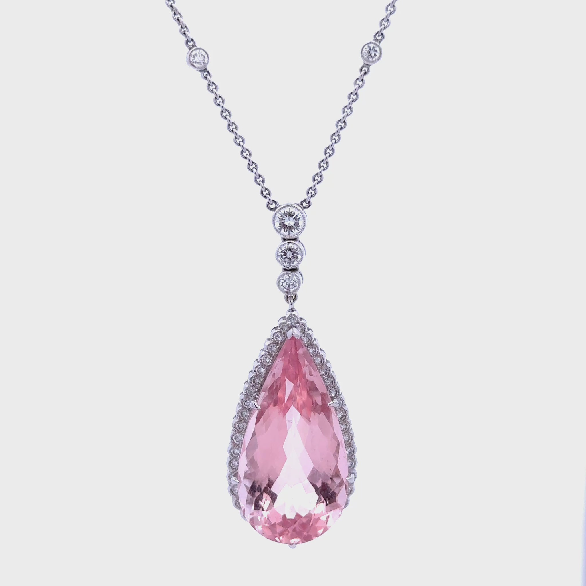 Elegant, luminous, and irresistibly feminine, this 18.16ct Morganite Pendant Necklace is a masterpiece of refined luxury. The focal point is a striking pear-shaped morganite, expertly cut to showcase its captivating blush-pink hue and delicate inner fire. Encircled by a halo of brilliant-cut diamonds, the gemstone radiates with an ethereal glow that enhances its romantic charm.