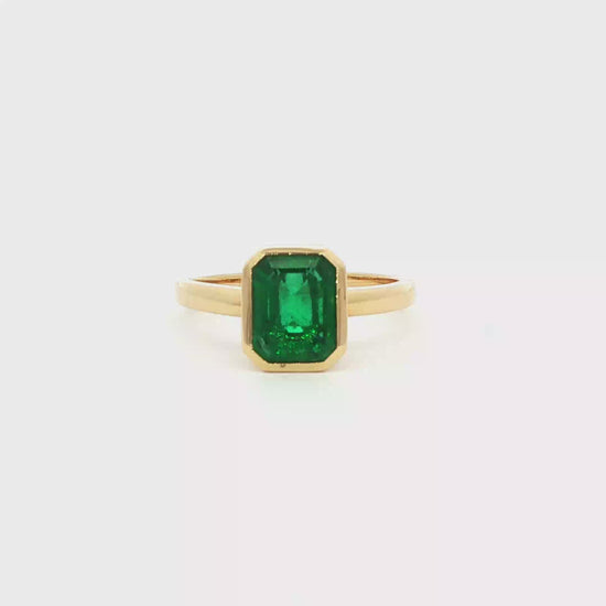The gemstone is set within a smooth 18ct yellow gold rub-over setting, offering both protection and a contemporary finish. The warm gold enhances the emerald’s vibrant colour, while the sleek band keeps the design minimal and sophisticated, allowing the centre stone to take full focus.
