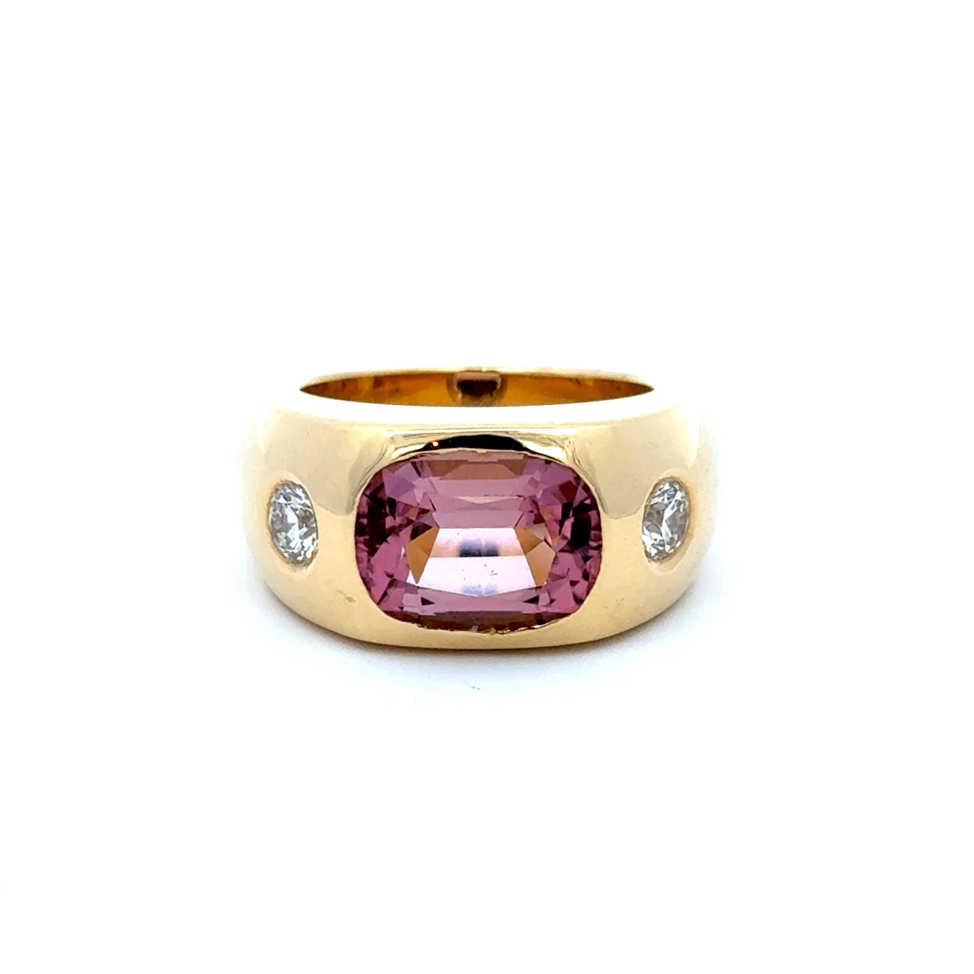 This vibrant gypsy-set band celebrates colour, craftsmanship, and confident style. At its centre rests a beautifully cut pink tourmaline, glowing with rich rose-pink tones that shift softly in the light. Its bold presence is enhanced by two sparkling round white diamonds set flush into the warm 18ct yellow gold band, creating a harmonious balance of colour and brilliance.