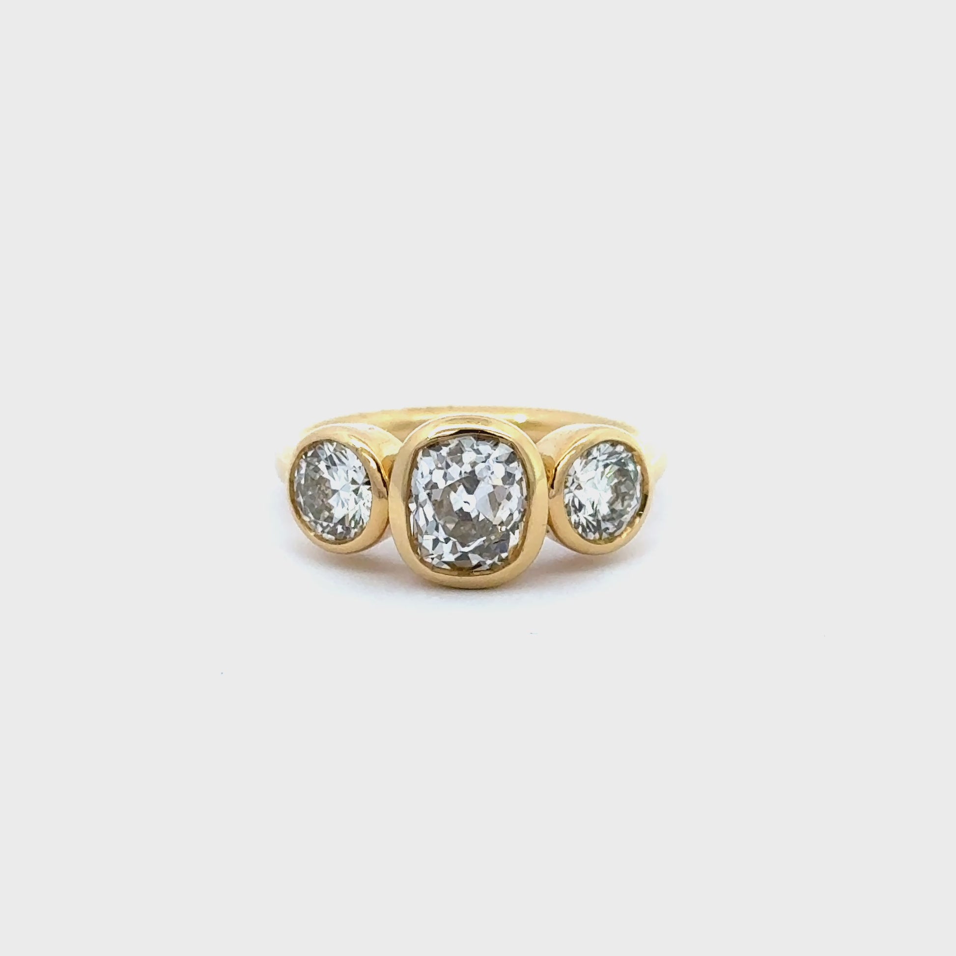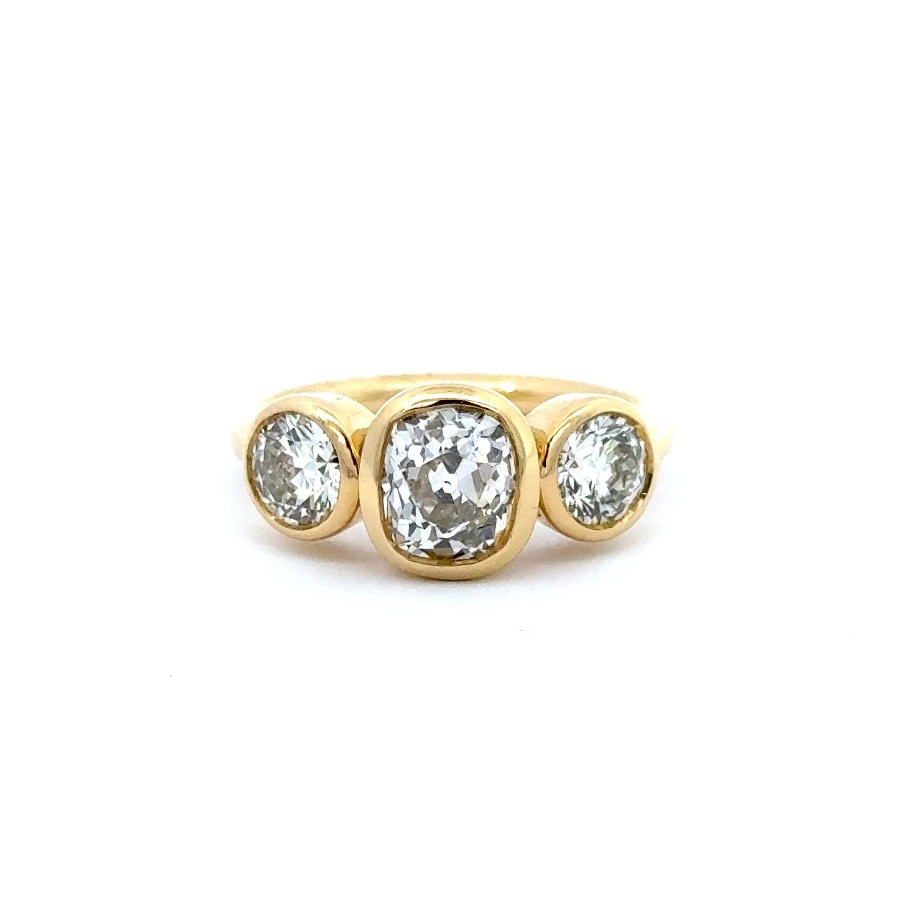 At its centre sits an impressive 1.66ct diamond, chosen for its presence and depth, flanked by two perfectly matched side stones with a total weight of 1.22ct. Graded J colour and VS2 clarity, the diamonds offer a soft, elegant warmth and exceptional sparkle, enhanced by the smooth, rounded gold settings that frame each stone.
