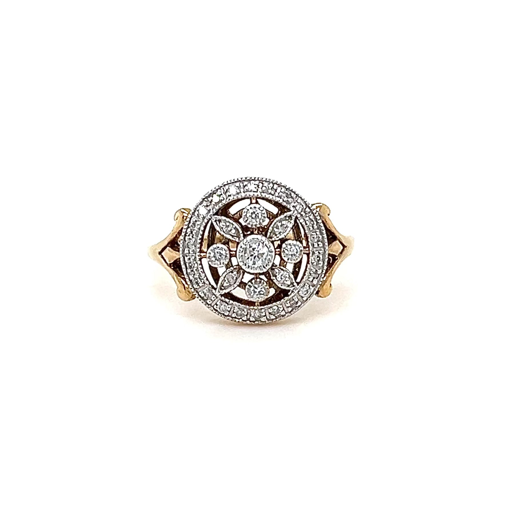 Crafted in 9ct yellow and white gold, this vintage-style ring features intricate detailing with a warm yellow gold band and delicate white gold accents. A timeless piece that adds sophistication to both formal and casual looks, perfect as a gift or a cherished addition to your collection.