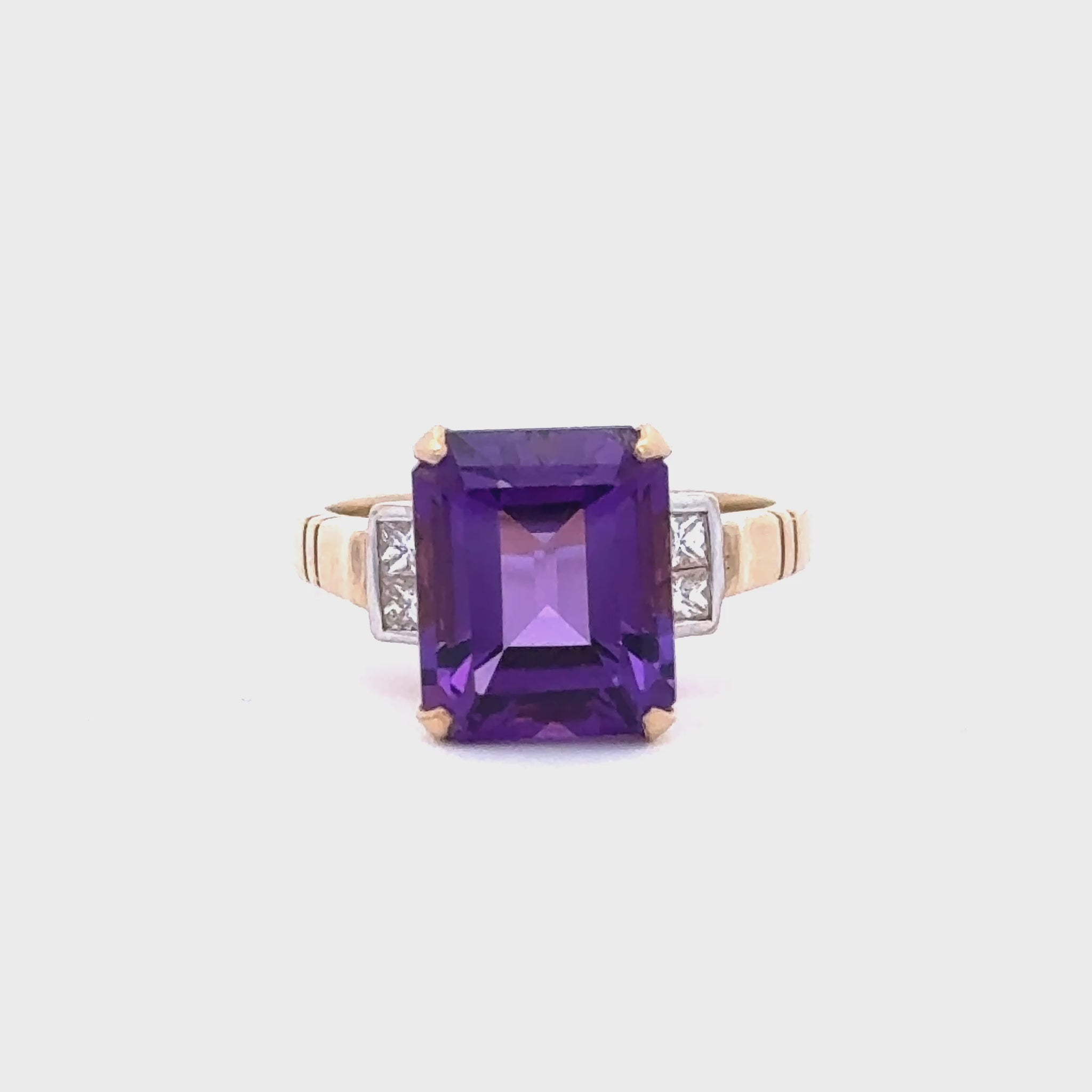 Bold, regal and beautifully expressive, this striking ring showcases a captivating emerald-cut amethyst in a rich, velvety purple hue. The generously proportioned centre stone is framed by warm 9ct yellow gold claws, allowing light to illuminate its depth of colour and clean, architectural facets.