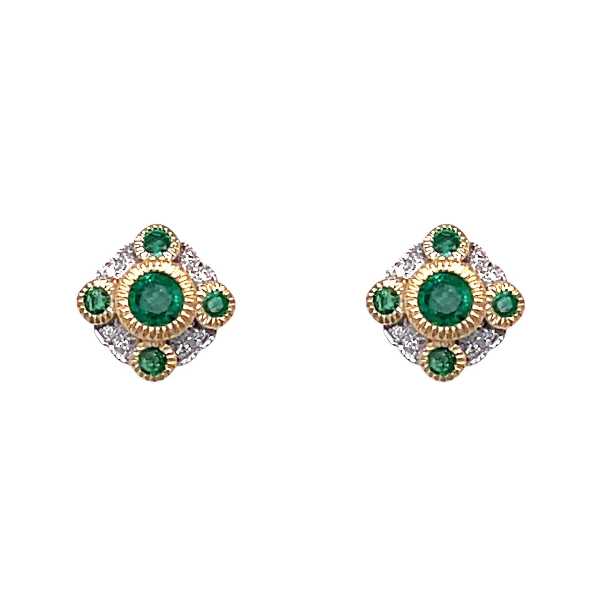 Emerald and diamond stud earrings crafted in 9ct yellow gold, designed with intricate detailing and rich colour contrast.