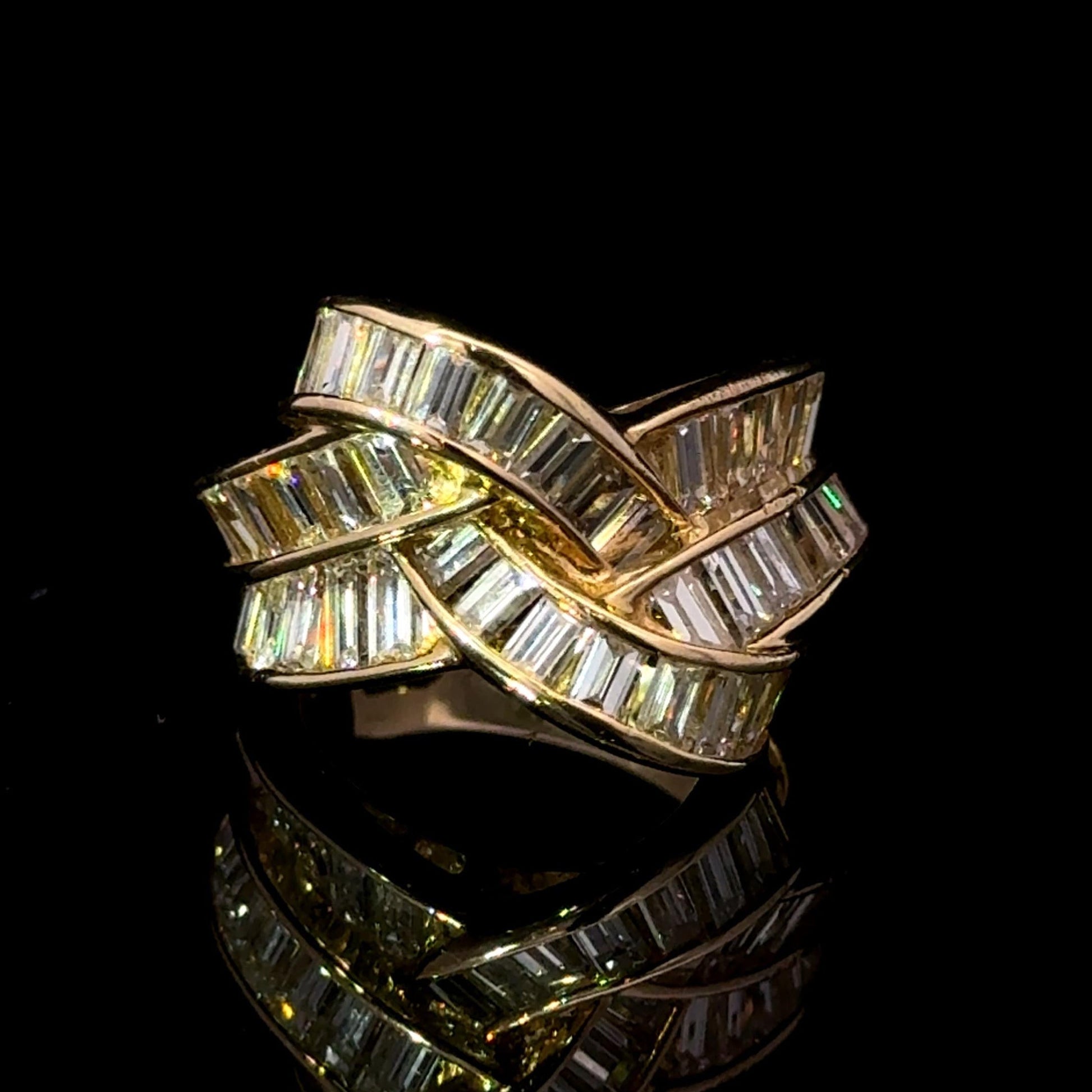 A bold yet elegant statement, this 18-carat yellow gold crossover ring is set with 3.00 carats of step-cut diamonds, precision-set in a striking interwoven design. The clean geometry of the diamonds contrasts beautifully with the warmth of polished yellow gold, creating a look that is both powerful and refined.
